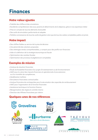 Notre valeur ajout%u00e9e %u2022 Fiabilit%u00e9 des chiffres et des simulations%u2022 Excellente compr%u00e9hension des sous-jacents et d%u00e9terminants de la d%u00e9pense, gr%u00e2ce %u00e0 nos expertises m%u00e9tier%u2022 Prise en compte de tous les %u00e9l%u00e9ments d%u2019actualit%u00e9%u2022 Des outils de simulation performants et adapt%u00e9s%u2022 Parfaite connaissance de tous les outils de gestion ainsi que de tous les cadres comptables publics et priv%u00e9sNotre impact %u2022 Des chiffres fi ables au service de la prise de d%u00e9cision%u2022 Une p%u00e9rennit%u00e9 des solutions propos%u00e9es%u2022 Des arbitrages rendus compr%u00e9hensibles, y-compris pour des profi ls non-fi nanciers%u2022 Aide %u00e0 la d%u00e9fi nition de la strat%u00e9gie %u00e9conomique et fi scale%u2022 Optimisation des recettes fi scales%u2022 Optimisation des processus budg%u00e9taires et comptablesExemples de mission %u2022 Analyse de situation fi nanci%u00e8re %u2022 %u00c9tude de faisabilit%u00e9 fi nanci%u00e8re d%u2019un projet d%u2019investissement ou de fonctionnement %u2022 AMO pour le calcul des impacts fi nanciers et op%u00e9rationnels d%u2019une extension ou d%u2019un transfert de comp%u00e9tences %u2022 Mod%u00e9lisation tarifaire%u2022 Simulations fi nanci%u00e8res contractuelles %u2022 Analyse fi nanci%u00e8re de contreparties pour la s%u00e9curisation des capacit%u00e9s de remboursement %u2022 AMO pour l%u2019organisation de la fonction fi nanci%u00e8re %u2022 Assistance technique %u00e0 la fonction fi nance%u2022 R%u00e9organisation des r%u00e9gies et contr%u00f4le interne%u2022 Direction des Affaires fi nanci%u00e8res par int%u00e9rimQuelques-unes de nos r%u00e9f%u00e9rences Finances1 2 | GROUPE SPQR