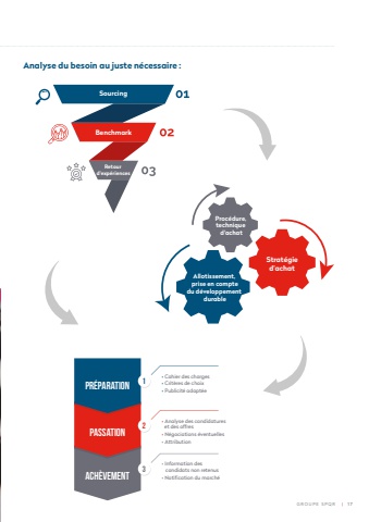 Analyse du besoin au juste n%u00e9cessaire :Retour d'exp%u00e9riencesBenchmarkSourcingAllotissement, prise en comptedu d%u00e9veloppement durableProc%u00e9dure, technique d'achatStrat%u00e9gied%u2019achat1 Pr%u00e9parationPassationAch%u00e8vement%u2022 Cahier des charges%u2022 Crit%u00e8res de choix%u2022 Publicit%u00e9 adapt%u00e9e2 %u2022 Analyse des candidatures et des offres%u2022 N%u00e9gociations %u00e9ventuelles%u2022 Attribution3 %u2022 Information des candidats non retenus%u2022 Notification du march%u00e9GROUPE SPQR | 1 7