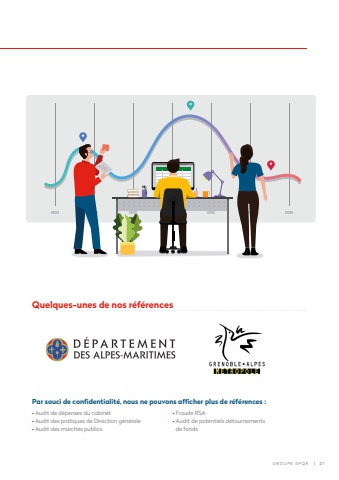 Par souci de confi dentialit%u00e9, nous ne pouvons affi cher plus de r%u00e9f%u00e9rences :%u2022 Audit de d%u00e9penses du cabinet %u2022 Audit des pratiques de Direction g%u00e9n%u00e9rale %u2022 Audit des march%u00e9s publics %u2022 Fraude RSA %u2022 Audit de potentiels d%u00e9tournements de fondsQuelques-unes de nos r%u00e9f%u00e9rences GROUPE SPQR | 2 1