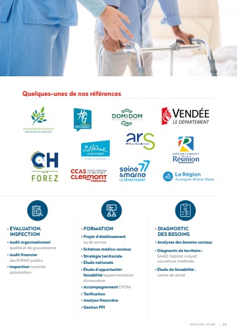 %u2022 %u00c9VALUATION, INSPECTION> Audit organisationnelqualit%u00e9 et de gouvernance > Audit fi nancierdes EHPAD publics> Inspection/contr%u00f4le autorisation %u2022 FORMATION> Projet d%u2019%u00e9tablissementou de service> Sch%u00e9mas m%u00e9dico-sociaux> Strat%u00e9gie territoriale> %u00c9tude nationale> %u00c9tude d%u2019opportunit%u00e9faisabilit%u00e9/exp%u00e9rimentation d%u2019innovation> Accompagnement CPOM > Tarifi cation> Analyse fi nanci%u00e8re> Gestion PPI%u2022 DIAGNOSTIC DES BESOINS> Analyses des besoins sociaux> Diagnostic de territoire : SAAD, Habitat inclusif, couverture m%u00e9dicale%u2026> %u00c9tude de faisabilit%u00e9 : centre de sant%u00e9Quelques-unes de nos r%u00e9f%u00e9rences GROUPE SPQR | 2 5