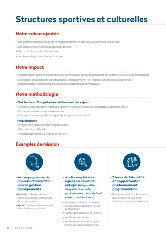Structures sportives et culturellesNotre valeur ajout%u00e9e %u2022 Une parfaite connaissance de la r%u00e9glementation et des enjeux (exemple crises, etc.)%u2022 Des exp%u00e9riences internes de gestion directe%u2022 Des outils de concertation locale%u2022 Un r%u00e9seau de partenaires techniquesNotre impact %u2022 Accompagner dans la prospective de construction ou de d%u00e9ploiement en %u00e9vitant les erreurs de conception %u2022 D%u00e9velopper l%u2019exploitation des structures : management, RH, fi nances, op%u00e9rations, exp%u00e9rience, programmation, marketing, business/d%u00e9veloppement commercial%u2026Notre m%u00e9thodologie %u2022 %u00c9tat des lieux : Compr%u00e9hension du besoin et des enjeux> Collecte documentaire (rapports d%u2019activit%u00e9s, bilans, donn%u00e9es comptables, donn%u00e9es RH%u2026) > Entretiens de terrain et visite de site > Concertation (enqu%u00eates en ligne, techniques d%u2019animation%u2026)%u2022 Pr%u00e9conisations> Projections (business plan, organisation) > Plan d%u2019action d%u00e9taill%u00e9 > Accompagnement %u00e0 la mise en %u0153uvreExemples de mission %u2022 Accompagnement %u00e0 la contractualisation pour la gestion d%u2019%u00e9quipements> Culturel : salle de spectacle, centre des congr%u00e8s, monument historique, casino> Sportif : centre aquatique, salle d%u2019escalade, espace loisirs%u2026%u2022 Audit complet des %u00e9quipements et des entreprises (soci%u00e9t%u00e9s d%u2019exploitation, clubs professionnels, clubs de haut niveau, associations%u2026)> Audit global de fonctionnement d%u2019un complexe sportif en vue de sa r%u00e9novation> Audit organisationnel et fi nancier> Audit salle de concert > Audit organisationnel et op%u00e9rationnel de club de haut niveau%u2022 %u00c9tudes de faisabilit%u00e9 et d%u2019opportunit%u00e9 : positionnement, programmation> Positionnement d%u2019un lieu vitrine d%u2019un territoire en vue de la valorisation du patrimoine local2 8 | GROUPE SPQR