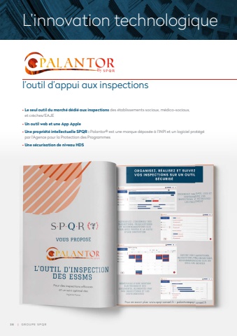 L%u2019innovation technologiquel%u2019outil d%u2019appui aux inspections %u2022 Le seul outil du march%u00e9 d%u00e9di%u00e9 aux inspections des %u00e9tablissements sociaux, m%u00e9dico-sociaux, et cr%u00e8ches/EAJE%u2022 Un outil web et une App Apple%u2022 Une propri%u00e9t%u00e9 intellectuelle SPQR : Palantor%u00ae est une marque d%u00e9pos%u00e9e %u00e0 l%u2019INPI et un logiciel prot%u00e9g%u00e9 par l%u2019Agence pour la Protection des Programmes%u2022 Une s%u00e9curisation de niveau HDS3 8 | GROUPE SPQR