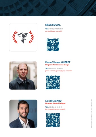 Pierre-Vincent GU%u00c9RETDirigeant-Fondateur du Groupe T%u00e9l. : +33 (0)6 21 39 44 75pierre-vincent.gueret@spqr-conseil.frSI%u00c8GE SOCIALT%u00e9l. : +33 (0)4 72 64 26 60 contact@spqr-conseil.frLo%u00efc BRAGARDDirecteur G%u00e9n%u00e9ral D%u00e9l%u00e9gu%u00e9 T%u00e9l. :+33 (0)6 67 44 81 76loic.bragard@spqr-conseil.fr%u00a9 Photos Adobe Stock | Plaquette 001 - 2023 | R%u00e9alisation : 3LIE