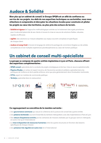 Un cabinet de conseil multi-sp%u00e9cialisteLe groupe se compose de quatre entit%u00e9s implant%u00e9es %u00e0 Lyon et Paris, chacune offrant des expertises compl%u00e9mentaires :%u2022 SPQR conseil, sp%u00e9cialiste de la conduite de projets strat%u00e9giques et de leur mise en %u0153uvre op%u00e9rationnelle%u2022 Populus %u00c9tudes, un acteur et expert reconnu de l%u2019%u00e9conomie sociale et solidaire, sp%u00e9cialis%u00e9 dans les politiques de l%u2019enfance et de la petite enfance, ainsi que plus g%u00e9n%u00e9ralement dans l%u2019%u00e9valuation territoriale%u2022 CITIA, expert en mati%u00e8re de commande publique%u2022 Tertialys, sp%u00e9cialis%u00e9 dans la restaurationCe regroupement se concr%u00e9tise de la mani%u00e8re suivante :%u2022 Une gouvernance commune qui assure la coh%u00e9rence de la posture de conseil des quatre entit%u00e9s%u2022 Une pr%u00e9sence territoriale couvrant l%u2019ensemble du territoire m%u00e9tropolitain, avec des implantations %u00e0 Paris et Lyon%u2022 Des retours d%u2019exp%u00e9rience enrichis par les centaines de missions r%u00e9alis%u00e9es par le groupe, tant en m%u00e9tropole, en outre-mer qu%u2019%u00e0 l%u2019international%u2022 La mise %u00e0 disposition de ressources humaines entre les quatre structures en fonction des besoins sp%u00e9cifiques de chaque mission%u2022 Une pr%u00e9sence tr%u00e8s r%u00e9guli%u00e8re en outre-mer et %u00e0 l%u2019internationalAudace & Solidit%u00e9 Bien plus qu%u2019un cabinet de conseil, le Groupe SPQR est un alli%u00e9 de confiance au service de vos projets. Au-del%u00e0 de nos expertises techniques ou sectorielles, nous nous attachons %u00e0 comprendre et d%u00e9crypter les situations locales pour construire et piloter les projets au c%u0153ur des territoires, au plus pr%u00e8s des acteurs de terrain.%u2022 Solidit%u00e9 et rigueur de l%u2019approche m%u00e9thodologique centr%u00e9e sur le traitement des sujets prioritaires pour la s%u00e9curit%u00e9/p%u00e9rennit%u00e9 de ses clients %u00e0 travers la mise en %u0153uvre de solutions fiables, robustes, rapides et efficaces%u2022 Agilit%u00e9 : des solutions sur mesure adapt%u00e9es aux enjeux souvent complexes et sp%u00e9cifiques de chaque client%u2022 Audace et sang-froid %u00e0 travers le langage de v%u00e9rit%u00e9 et le partage de convictions forg%u00e9es sur de solides comp%u00e9tences et de multiples exp%u00e9riences pluridisciplinaires au c%u0153ur de l%u2019action publiqueConseils & ExpertisesRestauration & Services8 | GROUPE SPQR
